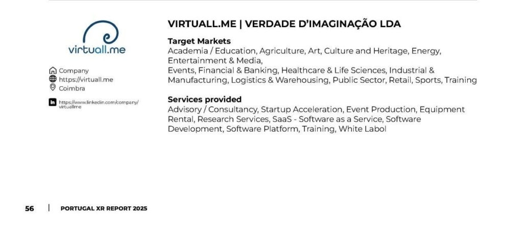 Virtuall.me reconhecida por I&D em Tecnologias Imersivas, através do Portugal XR Report 2025, uma iniciativa estratégica da APDC (Associação Portuguesa para o Desenvolvimento das Comunicações). Destaque no XR Directory(pag 56). Esta inclusão reconhece a nossa atuação como HUB de novas tecnologias I&D+i, especializado em soluções de VR e IA com valor científico e aplicabilidade no mercado. Em especial agradecemos ao Luis Bravo Martins por todo o seu apoio neste percurso.
